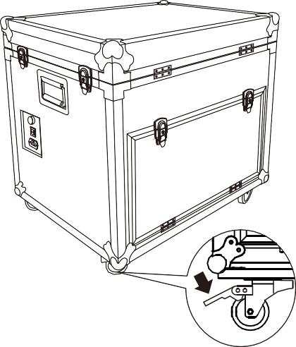 1. Push the flight case to the specify location, and then step the slide wheel pedals to fix pulleys and ensure the smooth and steady of case. |