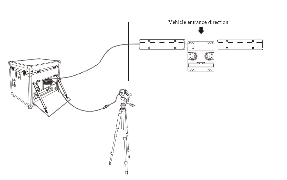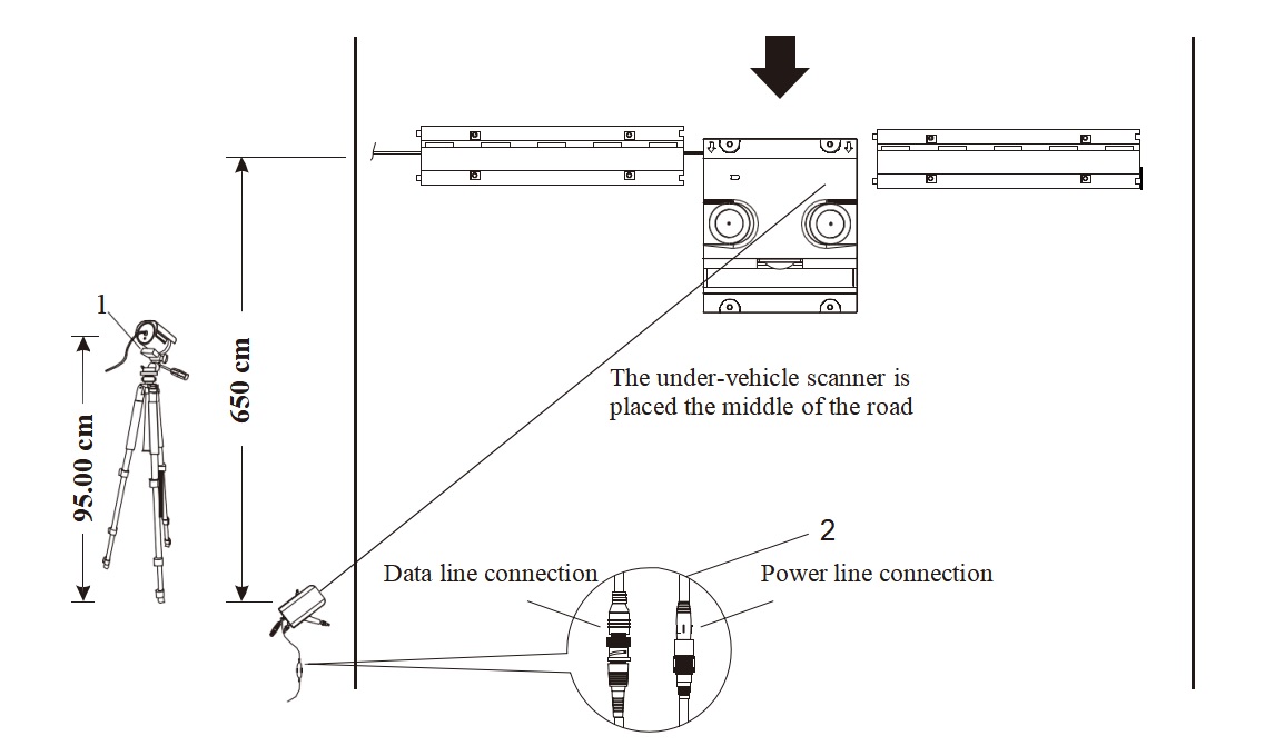 in the distance of 650cm and placed it besides the road and close to the flight case side, which is in the outer edge of the road, the direction of the lens must be toward to center of the under-vehicle scanner.