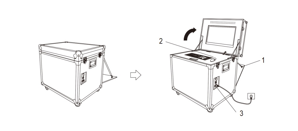 | 1. Flight case bottom | 2. Flight case upper cover | 3. External power source interface and power switch, etc. |