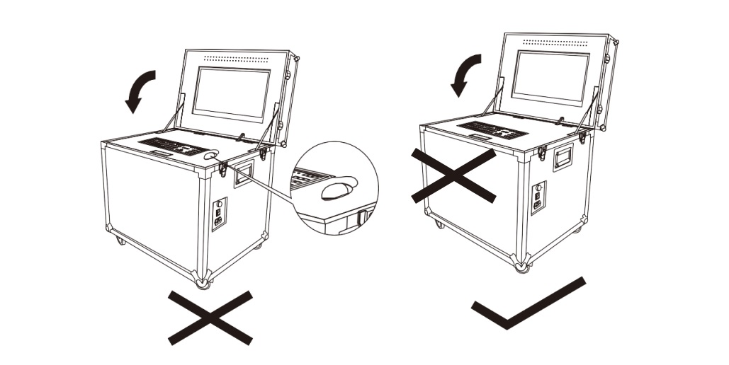 *Note: Before closing the cover of flight case, the mouse must be back to the mouse drop zone which is under the upper cover plate with shake-proof cotton layout. Or the screen will be touched the mouse and pressed.